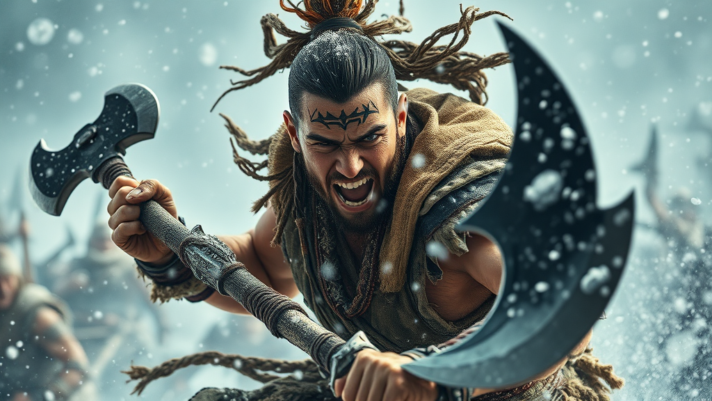 A dynamic close-up scene of a male barbarian with a mighty battle-axe, charging ferociously into battle, with a powerful battle-cry and intense facial expression. He wears a handcrafted, rugged cloth outfit adorned with tribal details, and his face is marked with fierce war paint. The backdrop is a chaotic battlefield, enveloped in a swirling snowfall, all lit with dramatic, cinematic lighting. The scene is crafted with hyper-realistic detail, using Unreal Engine 5 with RTX and ray tracing technology for a photorealistic effect. Subtle creative touches include enhanced textures on the warrior's garb, intricate designs in the war paint, and a slightly heightened sense of motion, giving the image a striking, immersive depth.