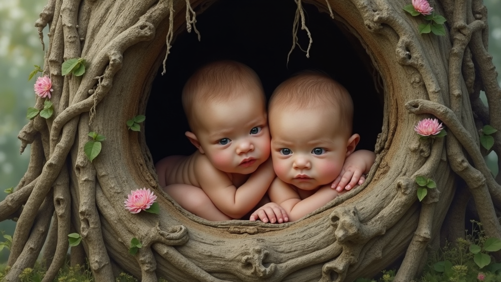 Two infants nestled within the ancient hollows of towering trees, depicted in hyperrealistic wildlife portrait style, overtly inspired by avian motifs. This imaginative scene blends the evocative artistry of Stephen Shortridge, Lilia Alvarado, and Bob Eggleton. The scene is rich in intricate detail akin to comprehensive nature studies, capturing the essence of the wilderness. The babies, with delicate features, are gently embraced by the gnarled and textured wood, their expressions reflecting curiosity and wonder. Subtle hints of vibrant feathers and soft, muted forest hues add depth, inviting viewers into a serene and magical realm where nature cradles new life.