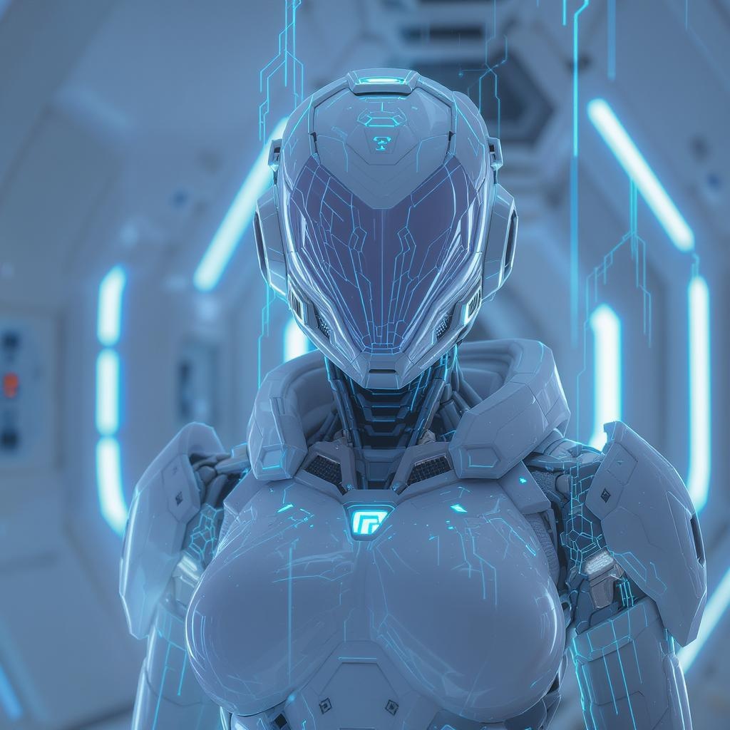 View this AI-generated image featuring female sci fi military cyborg in sleek white teflon armor adorned with an intricately designed helmet and detailed mask set against a white technical room with a cyberpunk flair neon blue illumination throughout complemented by radiant blue energy beams in the