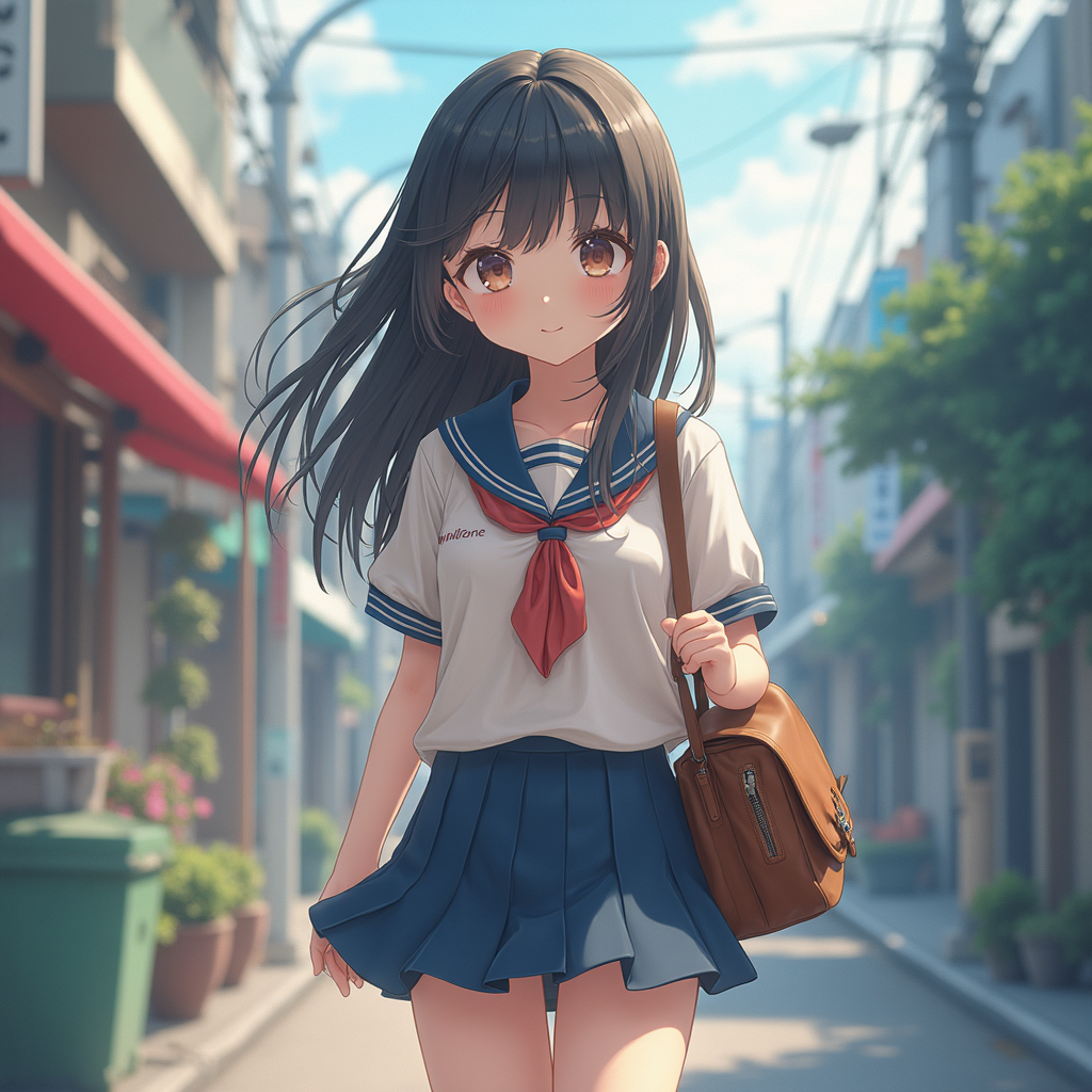 View this AI-generated image featuring a young anime girl strolls down a bustling street in her school uniform captured in stunning realistic 3d anime style her features are exquisitely detailed embodying the charm of a beautiful high school girl the artwork reminiscent of a visual novel key visual