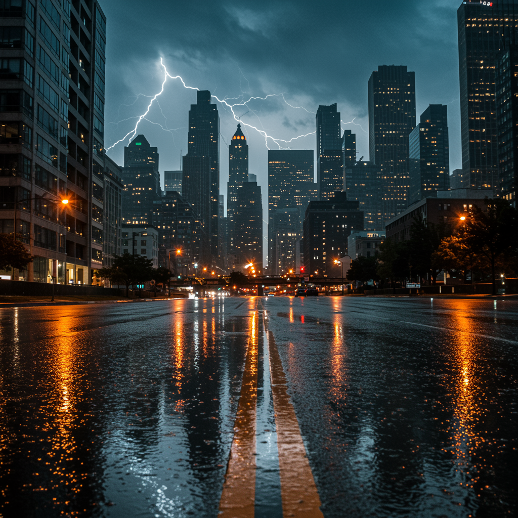 Glistening cityscape cloaked in shadows, rain-soaked streets, shimmering reflections on slick asphalt, muted city lights flickering through the downpour, distant thunder echoing between towering skyscrapers.