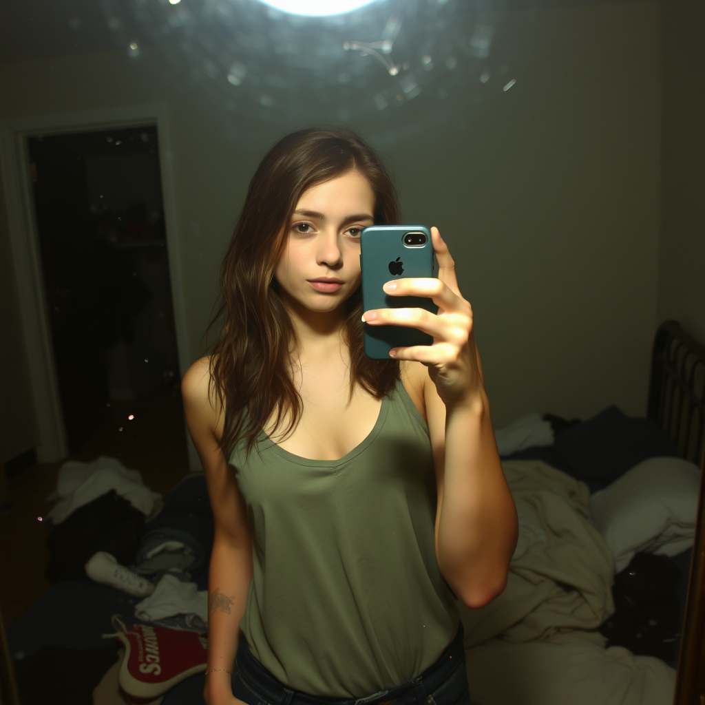 A young woman stands in front of a smudged mirror, capturing a selfie with her worn-out smartphone. The photo is grainy and somewhat out of focus, with dim lighting casting intricate shadows that soften her features. The room is messy, with a pile of clothes spilling onto the floor and a crumpled blanket covering half the bed. Her expression is relaxed yet intent, reflecting the phone's struggle to maintain clarity and adding an authentic, unrefined quality to the image. Dust specks cling to the mirror, contributing to the candid, everyday feel of the scene.