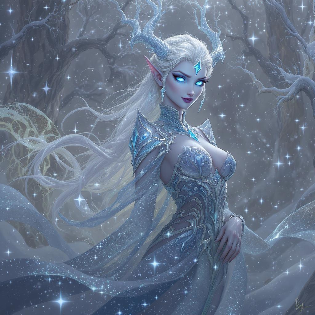 View this AI-generated image featuring elsa inspired fantasy character adorned in intricately detailed armor and elegant robes reminiscent of a mystical ice sorceress in a d d universe the digital painting exudes an otherworldly aura with sharp focus and highly detailed features capturing the essenc