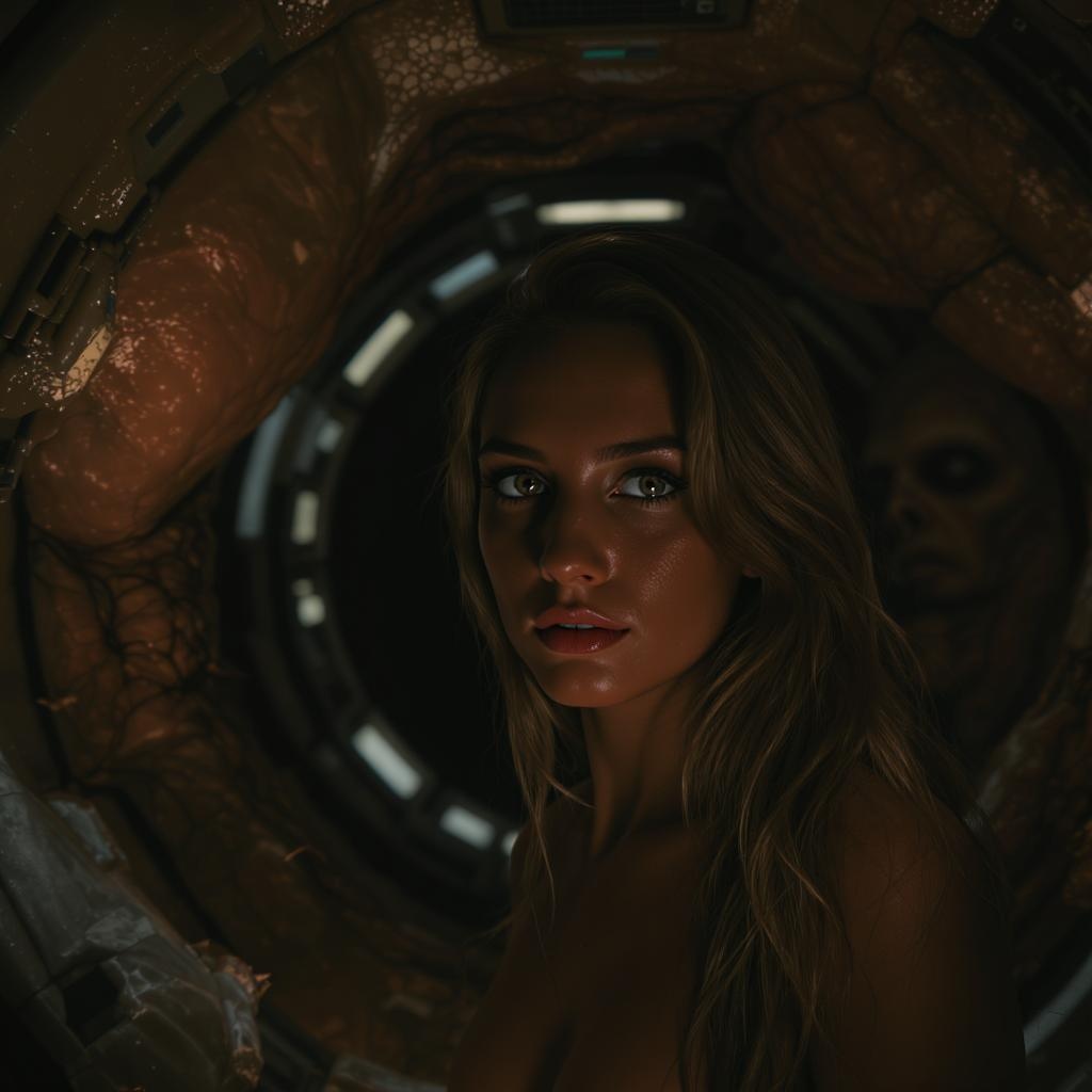 Girl: Sarah Louise Kerrigan in a dark, futuristic spaceship corridor, surrounded by natural chitin textures and an airlock in the background. The scene is highly detailed, with an expressive and intricate background showcasing hyper-realism. Her long hair flows with a subtle sheen, framing her gray eyes that flicker in the low, warm light. The atmosphere is filled with cinematic and flickering halogen lighting, highlighting the futuristic and natural textures around. Despite the sci-fi setting, the composition includes distorted and mutated forms, such as ambiguous anatomy and disfigured features, creating an unsettling, otherworldly vibe. The light accentuates the deformed hands and proportion anomalies, with shadows casting over blurred, duplicated figures, invoking a sense of unease. The environment comprises round windows and circles, with elements like cloudy eyes and lifeless expressions, contrasted by blinding light that enhances the surreal, immersive ambiance.