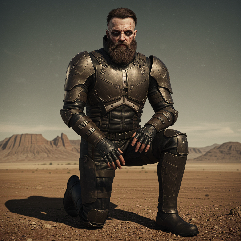 View this AI-generated image featuring full length portrait of a bearded man in sleek sci fi leather armor kneeling in a desert landscape the scene is gothic with a highly detailed face captured in dramatic cinematic lighting this digital art piece serves as character concept art featuring possible