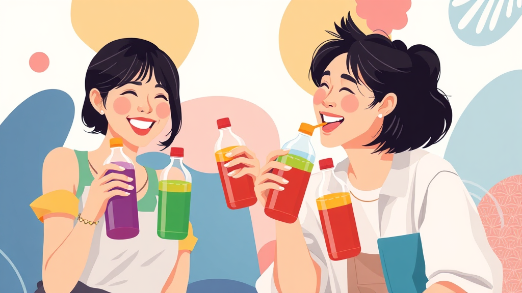 View this AI-generated image featuring flat illustration featuring two asian women and one asian man joyfully enjoying pet bottle drinks together positioned in the lower right corner of the scene the image showcases vibrant colors and a medium shot rendered in a simple minimalistic style synonymous