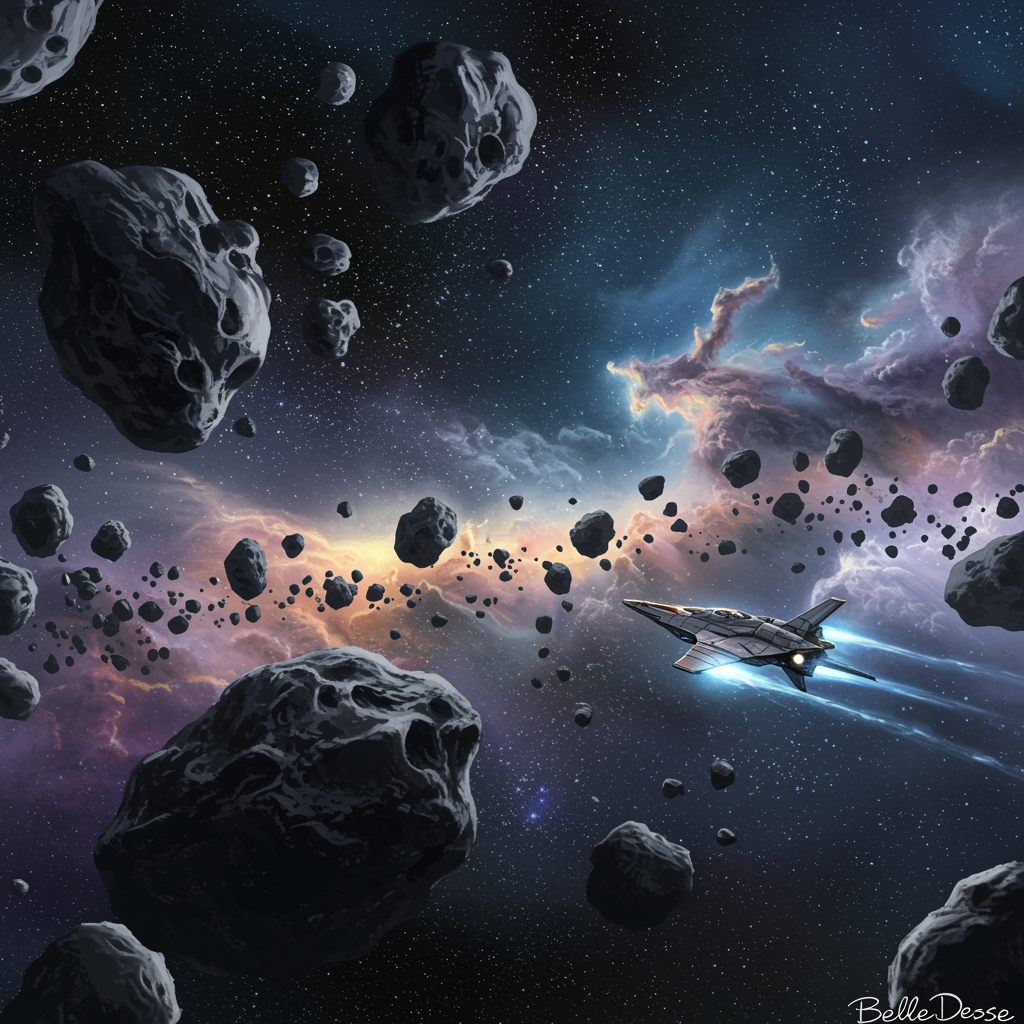 An intricately detailed painting of outer space shows an agile alien spacecraft maneuvering through a dense asteroid field, deftly avoiding massive asteroids. The scene captures the cold and vast emptiness of space, highlighting meteorites and distant stars sprinkled across the deep cosmic expanse. Wisps of colorful gas clouds add a touch of ethereal beauty to the scene, all rendered in the distinctive, poetic style of BelleDeesse.