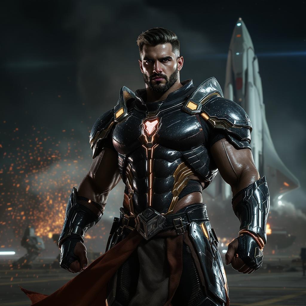 A 28-year-old Israeli Caucasian male with a muscular, perfectly toned body and a hairy chest stands tall. He possesses a smaller head and shiny, vibrant hair, embodying an alpha presence. The scene unfolds at a futuristic spaceport with a sci-fi ship launching in the background. The male is clad in intricately detailed plate and leather armor, exuding dominance and confidence. The setting is captured in a wide field of view, long shot, showing his full body from head to toe with a hyper-realistic, cinematic quality. The lighting is natural yet moody, with volumetric and ray-tracing effects enhancing the atmosphere. The scene is action-packed, rendered in 8K Ultra-HD with exquisite detail, reflecting natural textures and a photorealistic finish. His pose is dynamic, akin to a movie style, with a vibrant and richly detailed backdrop. The image maintains an ultra-realistic touch, avoiding common pitfalls like low quality or errors in anatomy.