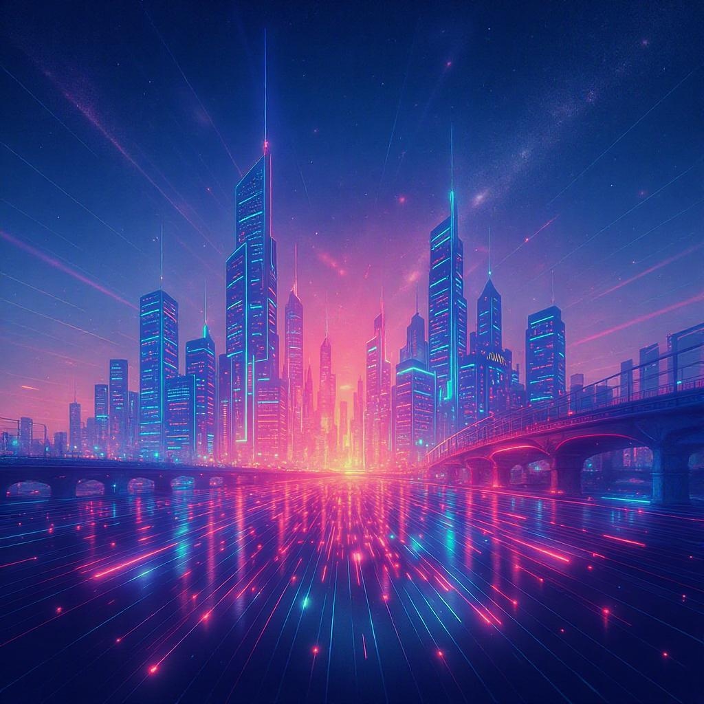 View this AI-generated image featuring glowing urban technology skyline with vibrant and dynamic light reflections creating a dreamlike futuristic atmosphere. Created using advanced AI technology, this image showcases vibrant colors. Perfect for creative projects, digital art, inspiration.