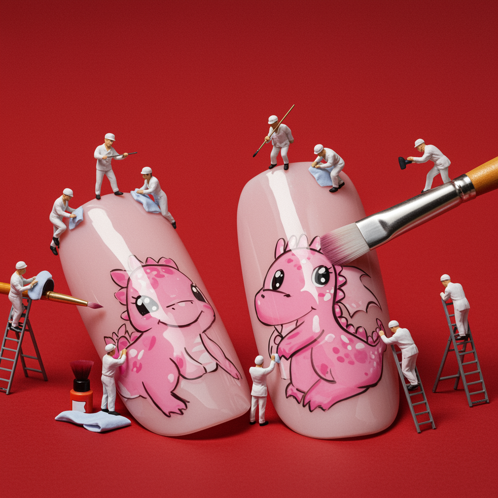 View this AI-generated image featuring a team of tiny meticulous workers each donning matching uniforms is busily engaged in transforming fingernails into canvases of whimsical art they are working on an oversized scale painting and sketching an adorable ombre pink dragon on the nails using giant pa