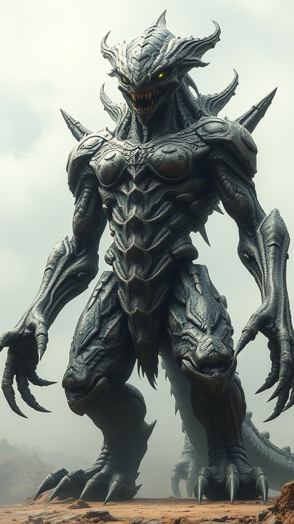 Unearthly creature, towering and menacing, exudes an aura of fear and power. Its entire form is intricately detailed with skin resembling ancient, weathered armor, each segment revealing unsettling patterns. Eyes glow with an intelligent malice, while elongated limbs end in razor-sharp appendages, poised for predatory action. Its presence is both majestic and horrifying, a testament to an unknown world’s evolution. The being radiates a sense of primal wrath and intelligence, standing as an apex predator in its realm, alien and otherworldly.