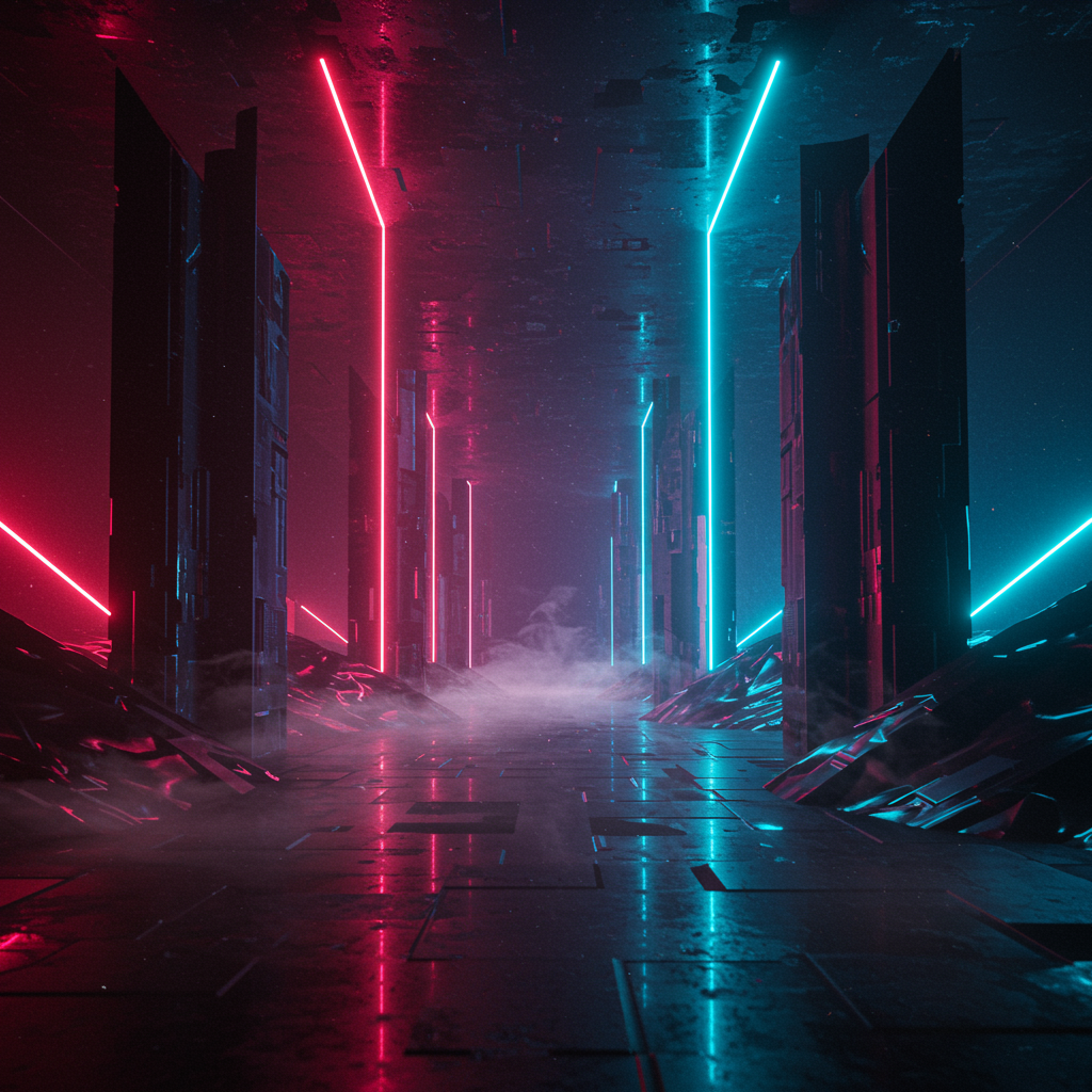 A mesmerizing cover design for a techno dark album featuring an abstract, futuristic landscape shrouded in shadowy hues and illuminated with pulsating neon lights. Ethereal mist swirls around towering geometric structures that stretch into a starless sky. The juxtaposition of sharp, angular forms with soft, elusive light patterns creates a sense of depth and intrigue. Dark metallic textures blend seamlessly with reflective surfaces, while subtle glimmers of vibrant color hint at hidden mysteries. This otherworldly scene beckons the viewer to dive into a world where technology and fantasy coexist, invoking a sense of curiosity and the desire to explore further.