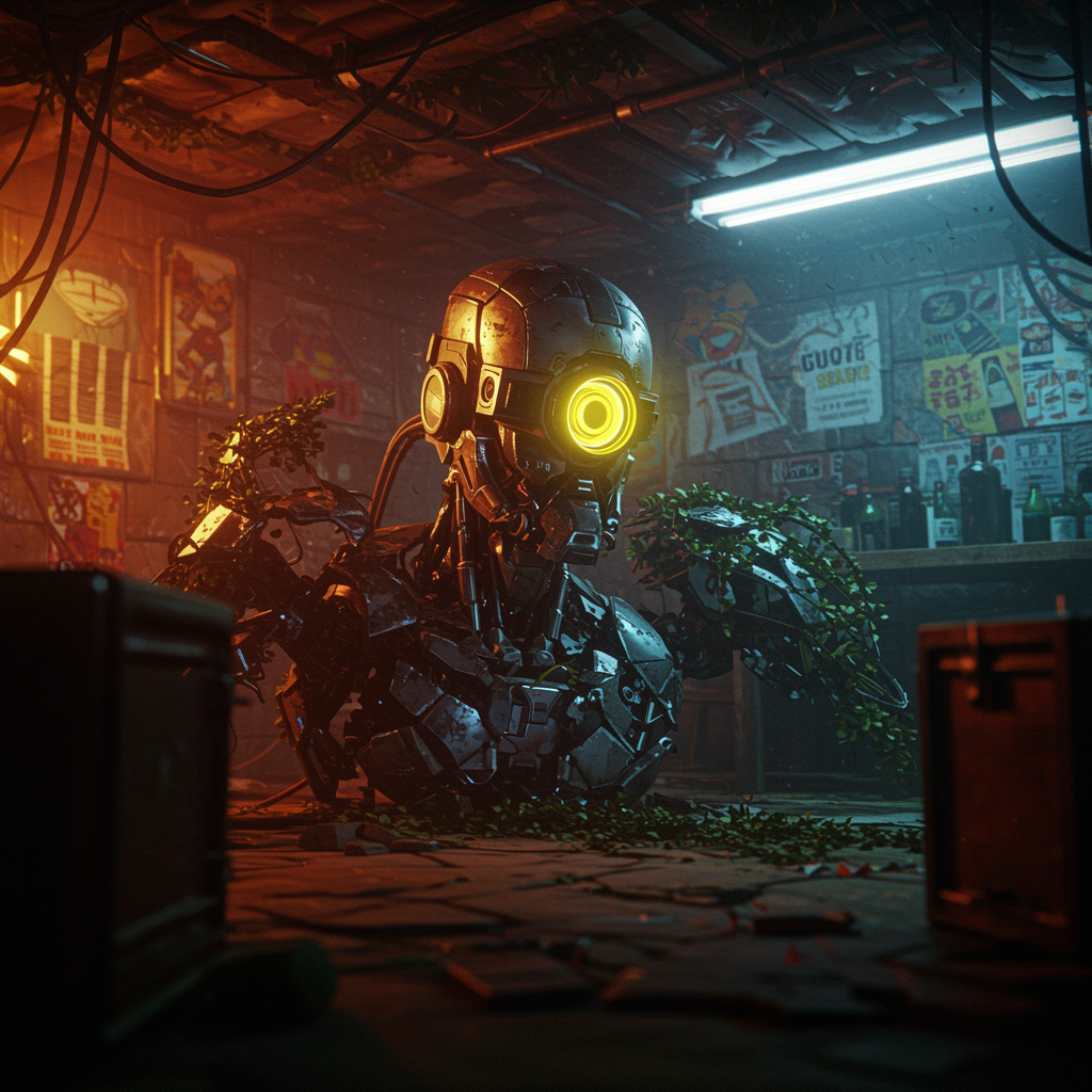 Masterpiece, best quality, ultra high resolution, wide-angle environmental shot in a cluttered and messy shack, dynamic action scene, League of Legends, vibrant and photo-realistic, dramatic and dark with sharp focus, 8k. A robot shattered into pieces with a glowing yellow visor, embodying a realistic sci-fi cyberpunk gangster theme, medium shot. Highly intricate details, created with Unreal Engine, cozy indoor lighting, influenced by James Gurney and Katsuhiro Otomo, with cinematic and vibrant lighting. Nature elements intertwined, inspired by Craig Mullins and Greg Rutkowski, featuring volumetric light, trending on ArtStation, rendered with Octane rendering, studio photo quality with sharp focus, and detailed, conveying a Cyber 2077 atmosphere.