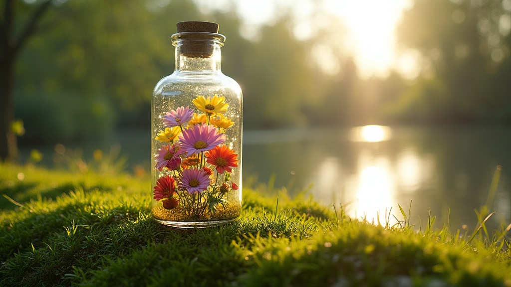 A vibrant display of colorful flowers encapsulated in a delicate glass bottle resting on a lush patch of grass under a brilliant, sunlit spring sky. Rays of light interact with the glass, creating a mesmerizing play of reflections. The scene is set against a backdrop of a serene river, adding a touch of drama and tension. Captured in ultra-high detail and sharp focus, the atmosphere presents a cinematic quality with elements of nature and tranquility. Despite the bright and joyful setting, there's an underlying tone of unease and tension that adds depth to the composition. This vivid scene combines elements of contrast and harmony, resulting in an emotionally stirring visual experience.