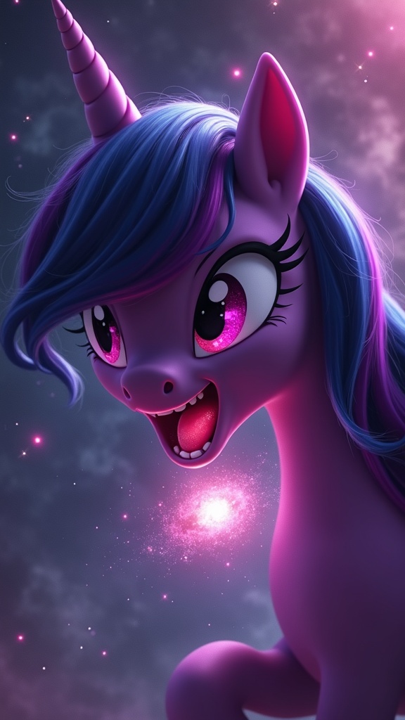 View this AI-generated image featuring a colossal twilight sparkle from my little pony larger than a galaxy suspended majestically in the cosmos an infinitesimal galaxy hovering near her mouth intensely zoomed in perspective of her open mouth ready to consume the galaxy eyes wide and glowing crimson