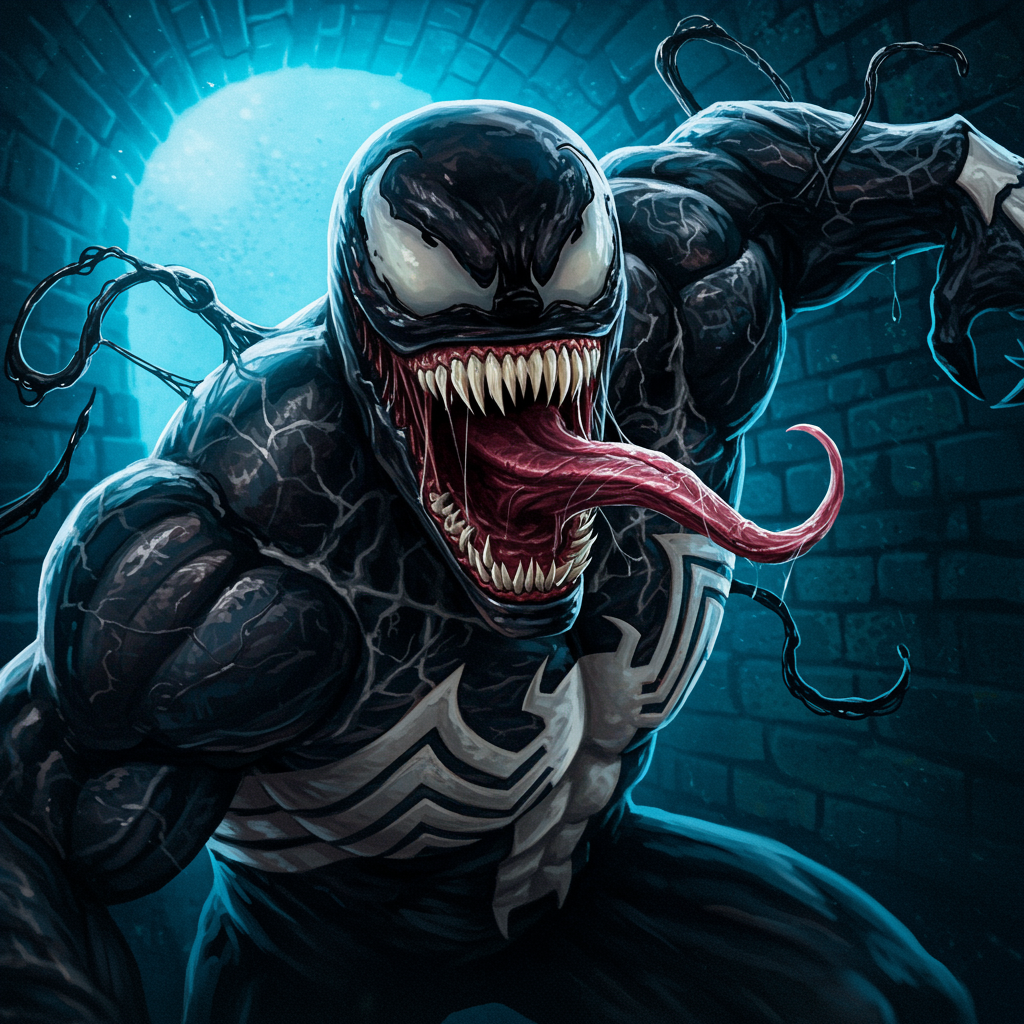 A highly detailed close-up of Venom with its mouth wide open in an intense, dynamic pose, inspired by the style of Charles Fremont Conner. The key art captures a vivid, dramatic moment with a clear, dark background that accentuates the character's features. The image is designed as a 1024px profile picture, showcasing a seamless blend of art techniques reminiscent of Artgeem. The artist incorporates a bright, deep blue background that mimics a textured wall, contrasting with the character's intricate details. The full-body portrait reveals a raw, powerful energy as Venom appears to be lunging from a shadowy sewer setting, emphasizing motion and tension.