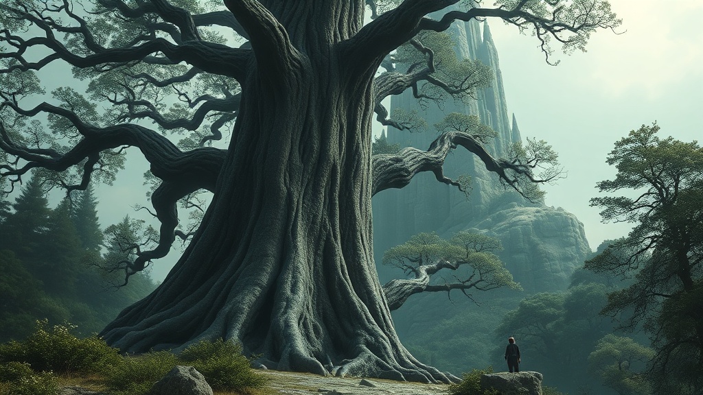 Treebeard standing solemnly at the base of the imposing tower of Orthanc, enveloped in a surreal, hyper-realistic digital painting style inspired by Alan Lee and John Howe. The scene is set in a fantastical realm, with a wide-angle perspective capturing the intricate details of the ancient ent with his gnarled bark and sprawling branches. The tower looms in the background, contrasting with the lush, animated foliage of Treebeard. Cinematic lighting highlights the textures of the landscape, with god rays piercing through a moody, dystopian atmosphere. The composition is stunningly beautiful, with sharp focus and highly detailed elements, rendered in 16k UHD HDR resolution. The setting is both enchanting and foreboding, with a dark, sci-fi edge. A sense of mystical power emanates from the scene, drawing the viewer into a world where nature and architecture collide. Muted, earthy tones dominate the color palette, enhancing the timeless, ethereal quality of this breathtaking artwork.