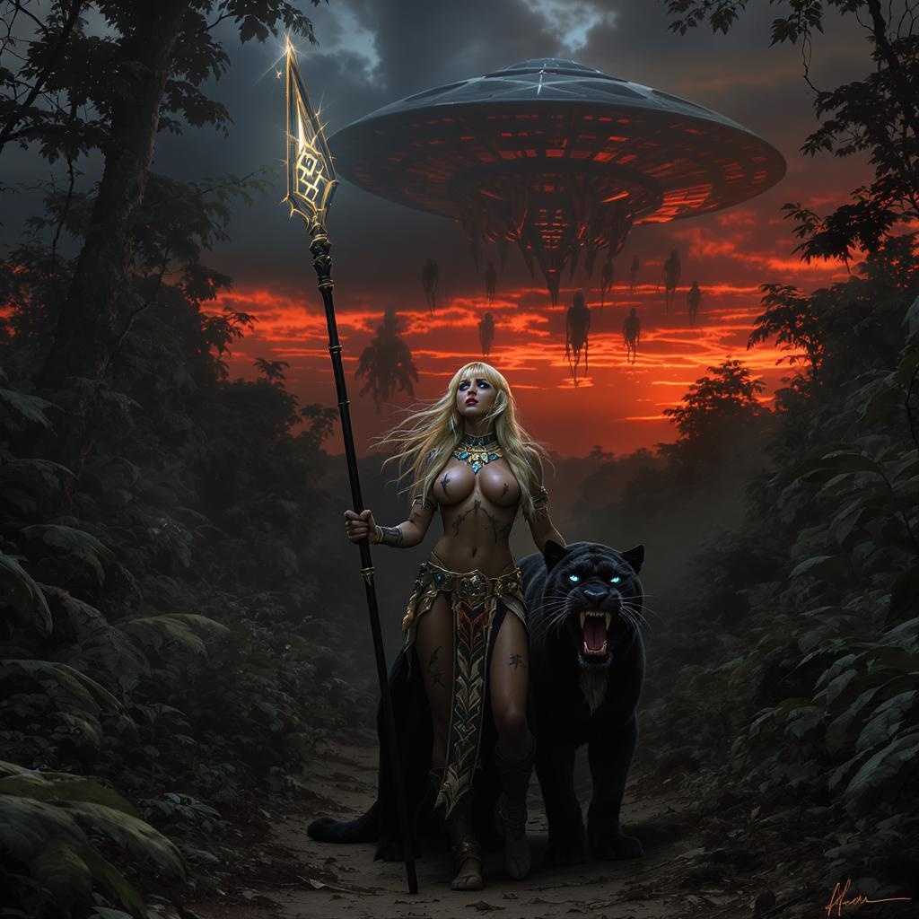 A hyper-realistic, full-body HD photo captures a beautiful human woman at the end of a jungle path, standing in a small clearing with a large Black Panther by her side. She holds a long scepter aloft, illuminating her way through the dark jungle. Her expression is confused yet stern as she faces the jungle, ready to defend her home and lands. The Panther, with eyes fixed on a strange object in the sky above the plains, roars with authority. The woman is intensely focused, her posture brimming with determination. Above them, alien beings with peculiar bodies and tentacles descend from the object. Her colorful ancient tribal tattoos adorn her skin, while her long blonde hair with bangs flows in the breeze. Dark sapphire blue eyes framed by elegant eyelashes complement her ornate eyeshadow. She wears an aging, ornate black dress with her belly bare, accentuated by an ornate gold and onyx belt and choker. The surrounding jungle is shadowed by branches and vines. Dark clouds encroach on the reddish-orange sunset in the background.