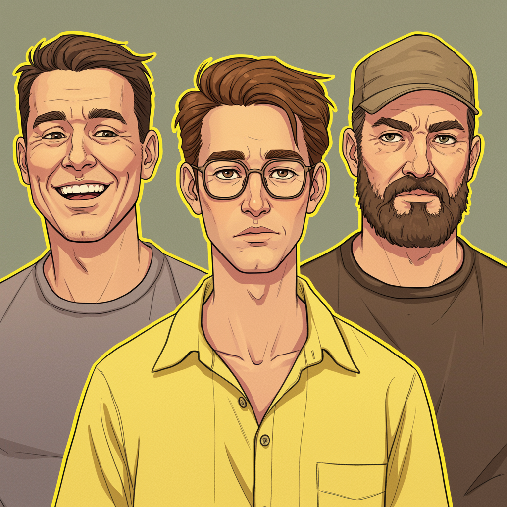 Illustration of three men outlined in yellow, set against a vertical aspect ratio, each showcasing distinct features and expressions while maintaining a cohesive design.