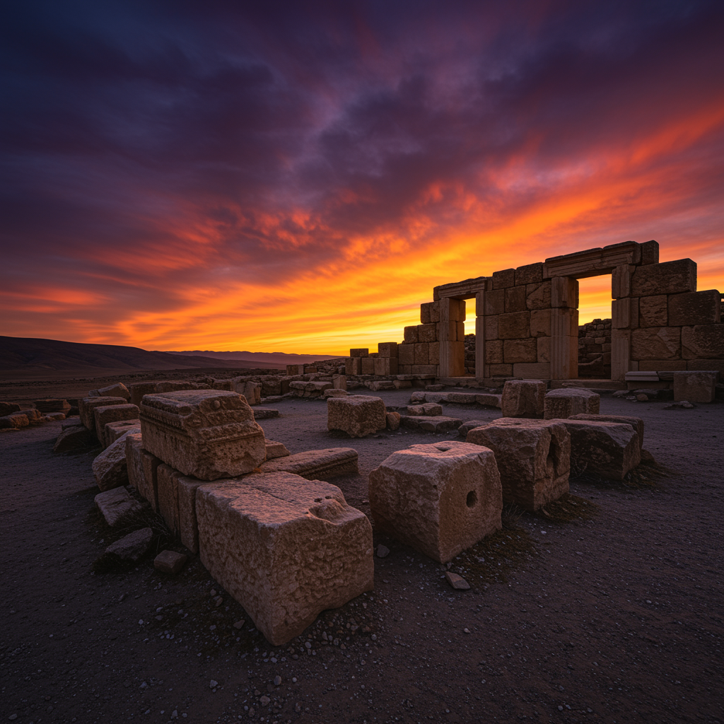 Ancient ruins nestled in a deserted landscape under a vibrant sunset, with an epic sky painted in hues of orange and purple. The scene is cinematic and captured in sharp focus, revealing intricate details of the weathered stones. The composition is reminiscent of studio photography, showcasing the textures and shadows with precision. Inspired by the works of Greg Rutkowski, the image conveys a sense of timeless beauty and mystery, as it trends on art platforms.