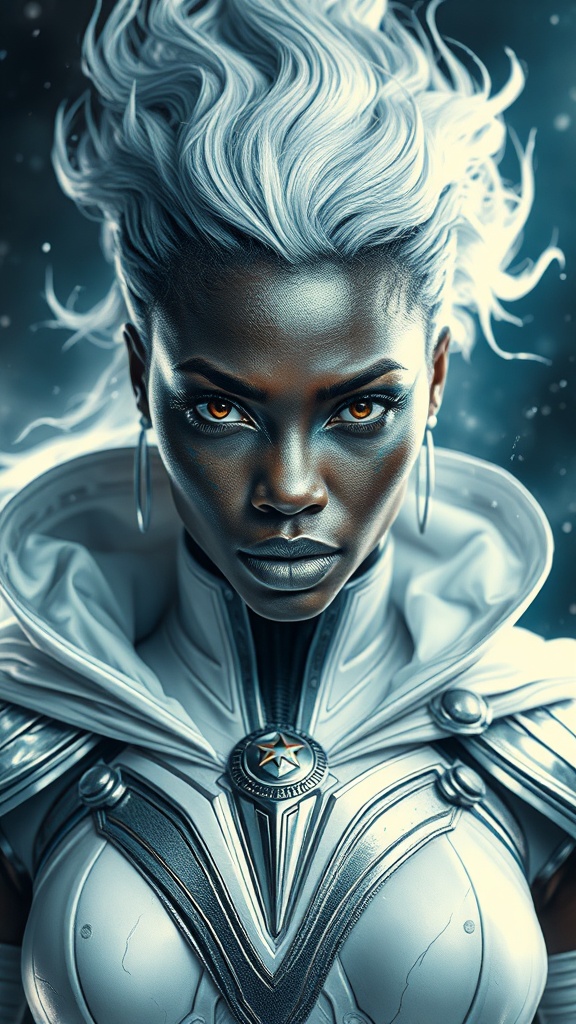 Create an ultra-detailed masterpiece of Storm from Marvel Inc. transformed into an extreme vivid fantasy realism style art. Capture her in hyper-realistic fantasy digital photography, with meticulous precision and care, perfectly centered in a composition that is overexposed to create a striking and ethereal atmosphere. Maintain a sharp focus to ensure exquisite details, with clear and bright elements that highlight her iconic white attire. Her expressive eyes, filled with power and compassion, should stand out, and her dynamic pose should showcase a flowing cape. This composition will seamlessly blend realism with fantasy to celebrate her essence of command and weather control in a visually stunning and imaginative setting, making a few creative modifications while preserving the core concept.