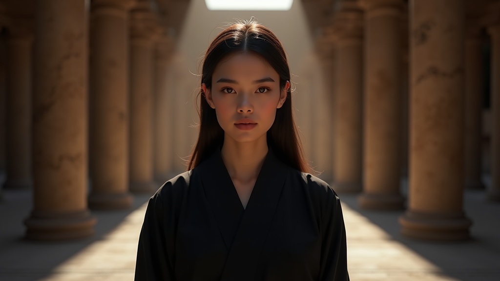 A young woman wearing elegant dark robes stands confidently in a grand temple setting. Her symmetrical eyes glisten with intensity under dramatic, expertly cast lighting. Capturing a breathtaking realism, the scene is brought to life in sharp focus and HD clarity, featuring intricate and highly complex details. The image is reminiscent of high-detail RAW photography with a hyperrealistic touch, achieved through advanced raytracing and physics-based rendering techniques. This ultra high-resolution depiction serves as a stunning, highly detailed CG 8K wallpaper, showcasing superb artistry in its execution. It's reminiscent of cgi and 3D elements, blending the precision of photography with artistic flair found in anime and digital paintings, devoid of any text errors or flaws.
