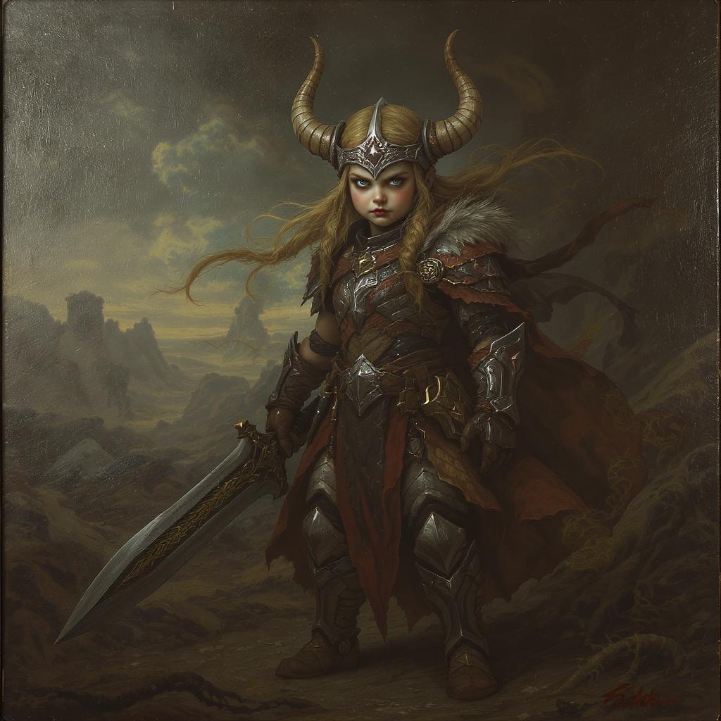 View this AI-generated image featuring a detailed full body concept art illustration dark soft focus depicting a little viking warrior girl clad in intricate clothing set in a biomutant dystopian world the scene is reminiscent of a plague style oil painting on canvas capturing micro details with an