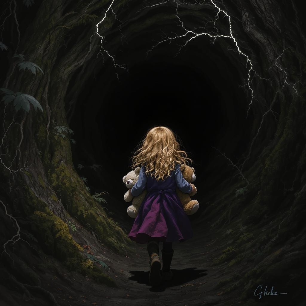 A curious young girl with long, golden hair steps cautiously into a shadowy forest, where the air crackles with mysterious energy. Clutching two well-loved teddy bears in her arms, she ventures deeper into the unknown, her heart racing with a mix of wonder and apprehension in the presence of the forest's dark enchantment.
