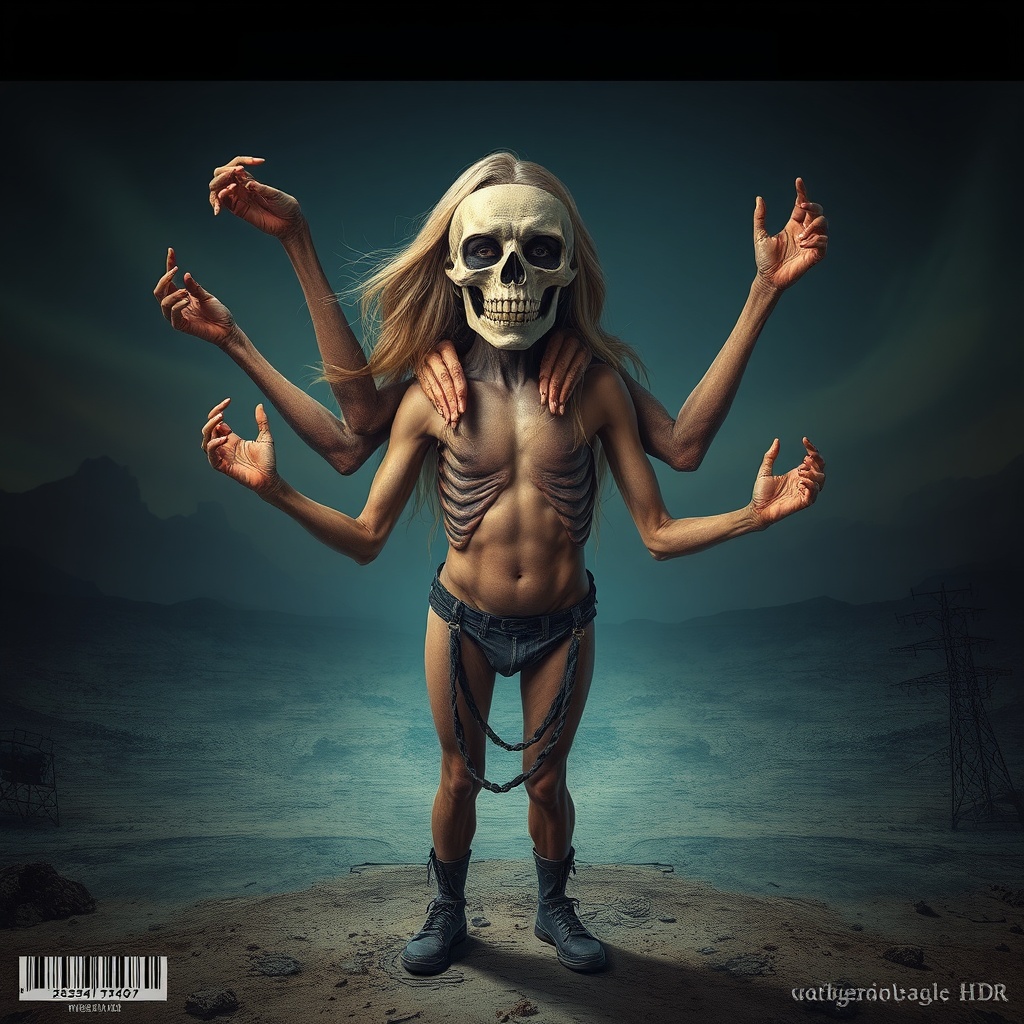 In a post-apocalyptic landscape, imagine a twisted depiction inspired by a fusion of Britney Spears and a Call of Duty aesthetic, featuring a character adorned with a skull tactical mask. The scene is rendered in HDR with dramatic rim lighting emphasizing the grotesque amalgamation. The character stands in a centered position, presenting an unsettling blend of deformed features and disfigured anatomy. Multiple mutated limbs jut out at odd angles, some floating as if disconnected. Oversaturated colors highlight the distortion in the blurry, doubled face, while the poorly drawn, distorted hands grasp at nothing. Amid this nightmarish vision, traces of censorship and noticeable watermarks add to the unsettling ambiance. Despite the supernatural appearance, there's an underlying commentary on the blurred lines between celebrity culture and digital warfare, captured in this grotesque, low-quality spectacle.