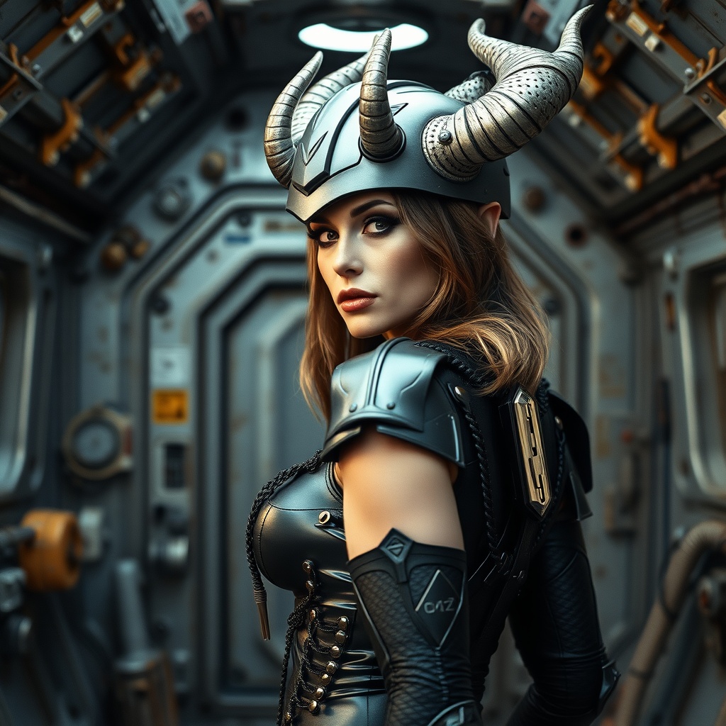 A full body shot of Julia Roberts in a side view, glancing over her shoulder with a captivating gaze, her appearance a fusion of glamorous kitsch and grungecore. Her elaborate armor merges the beauty of an orc girl with a devil's helmet adorned with large horns, paired with an open cyber suit displaying a navel piercing. She stands in the interior of a rusty space station, the background echoing a sci-fi and cyberpunk aesthetic in dark white and light silver tones. Her mysterious beauty is enhanced by exaggerated features in a style reminiscent of dragon art, with influences of Royo and Giger. The scene embodies dark art and is shot with the high quality of ferrania p30 film, capturing the essence of a futuristic and edgy universe.