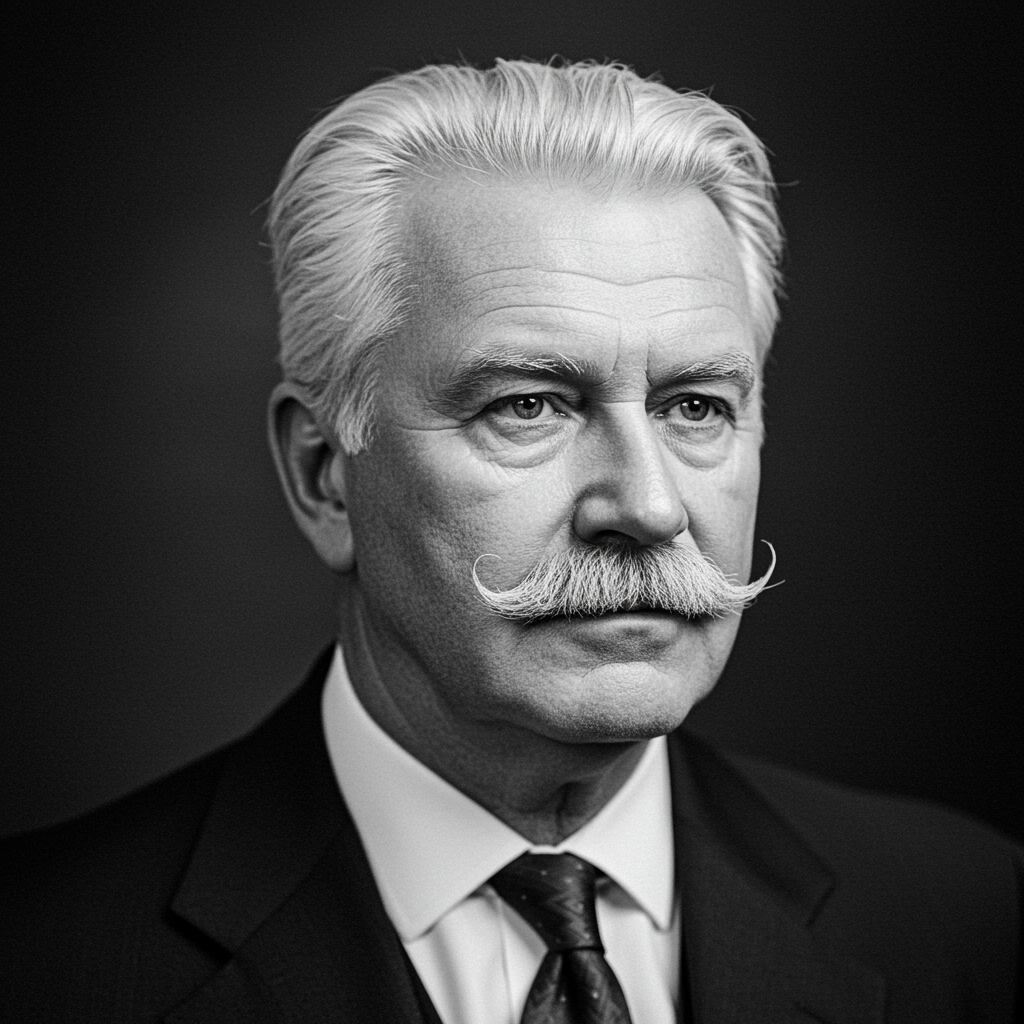 Image Type: Digital photograph, formal portrait. Overall Photographic Style: Photorealistic, high-resolution with sharp focus emphasizing the subject's face, combining classic portraiture with a contemporary twist. The style maintains clarity, detail, and an ageless quality. Lighting: Soft, even, diffused lighting predominantly from the front-left, creating gentle highlights and subtle shadows on the contours. The lighting ensures a balanced and natural presentation of the subject. Depth of Field: Shallow to moderate, keeping the subject's face and upper body sharply in focus while the background is softly blurred to maintain emphasis on the subject. Color Palette: Monochromatic. A rich range of grayscale with profound blacks for the suit, bright whites for the hair and shirt collar, and a comprehensive array of nuanced mid-grays enhances depth and texture. Subject Details: Age: Appearing in the vicinity of late 40s to 60s. Expression: The subject's gaze is serious and direct, indicative of intelligence and contemplation, with eyes fixed ahead conveying focus and depth of thought. Face Shape: Oval to slightly rectangular, with a broad forehead and a strong jawline. Hair: Well-groomed and parted on the left, showcasing a slightly voluminous and wavy texture towards the front. Hair Color: Light, appearing white or very light gray. Hair Style: Short to medium length, stylishly combed back, accentuating a neat side part. Eyes: Light-colored, almond-shaped, deep-set with well-defined eyelids. Eyebrows: Medium thickness, relatively straight, matching the hair's light color. Nose: Straight and prominent with a well-defined structure. Mouth and Lips: Mostly obscured by a prominent mustache, but the lips that are visible appear thin and set firmly. Chin: Broad, rounded, with a slight cleft or dimple apparent. Distinguishing Features: A notable thick, well-groomed mustache extending slightly beyond the corners of his mouth. Body and Clothing Details: Pose: Upper body portrait, capturing the head, shoulders, and upper chest as the subject angles slightly right with a forward gaze and an upright, formal posture. Clothing: Dark, formal suit jacket, possibly woolen, over a light-colored shirt. A dark necktie is adorned with a decorative pin or clasp. A glimpse of a dark waistcoat may be visible. Background: Plain, smooth, solid-colored, likely a medium gray or dark neutral, uniformly lit to ensure focus on the subject. Overall Mood/Atmosphere: Formal, dignified, intellectual, with a sense of seriousness and timelessness evoking authority and academic presence.