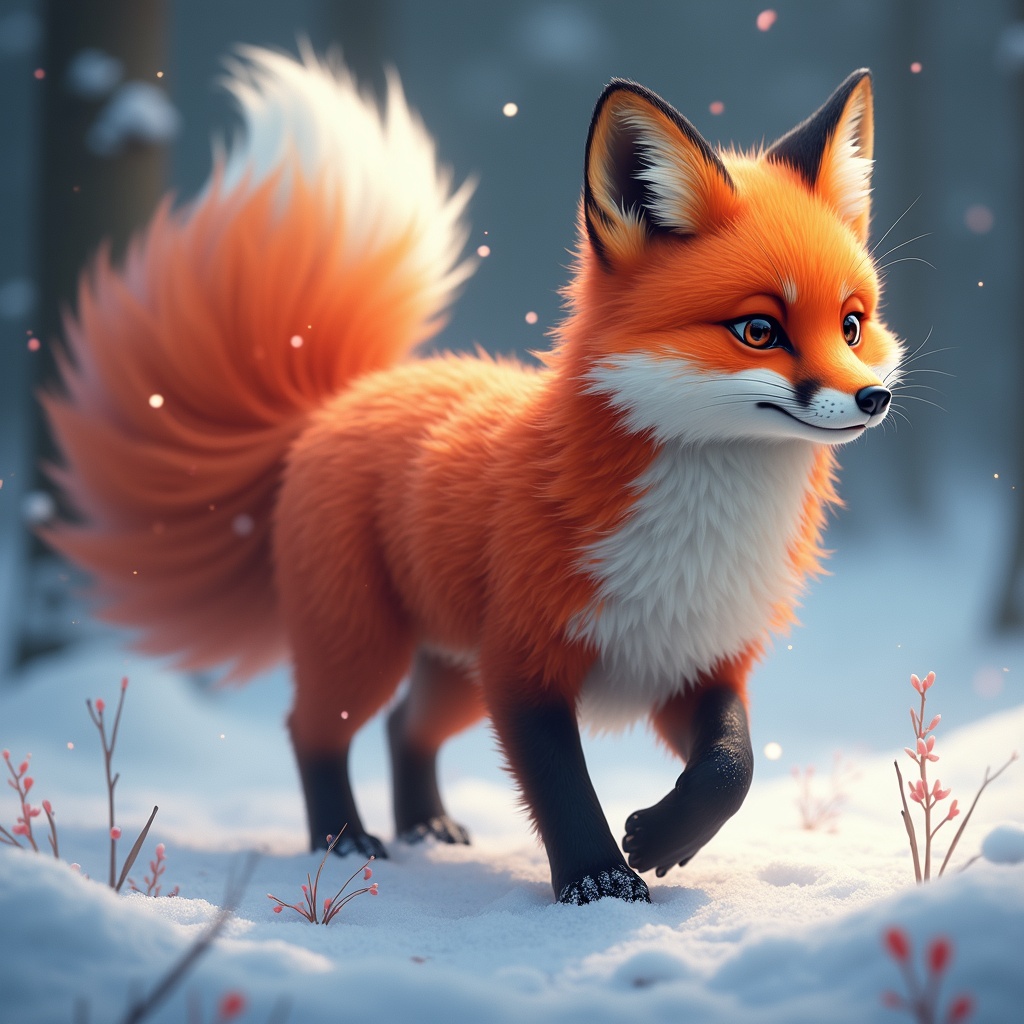 View this AI-generated image featuring a vivid and lifelike fox its fur a rich blend of fiery oranges and deep reds with white patches gleaming like sunlight on snow the creature s eyes are sharp and intelligent sparkling with curiosity and wisdom it moves with fluid grace its tail a mesmerizing swi