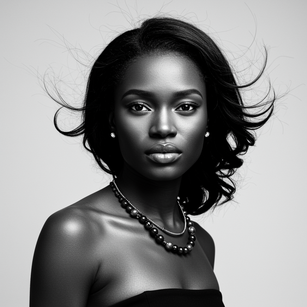 View this AI-generated image featuring a striking black and white portrait of an elegant woman with african heritage set against a light background to create a stark contrast her facial features are sharp and mesmerizing with fine details capturing her expressive eyes that gaze purposefully into the