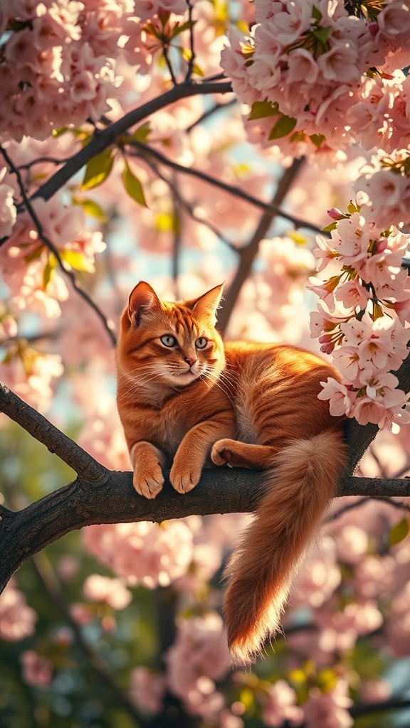 View this AI-generated image featuring a vibrant photo capturing a ginger tabby cat lounging on a tree in full bloom its fluffy tail cascading alongside the branches bathed in warm cinematic sunlight that filters through the blossoms creating a dreamy nostalgic atmosphere akin to an old film snapsho