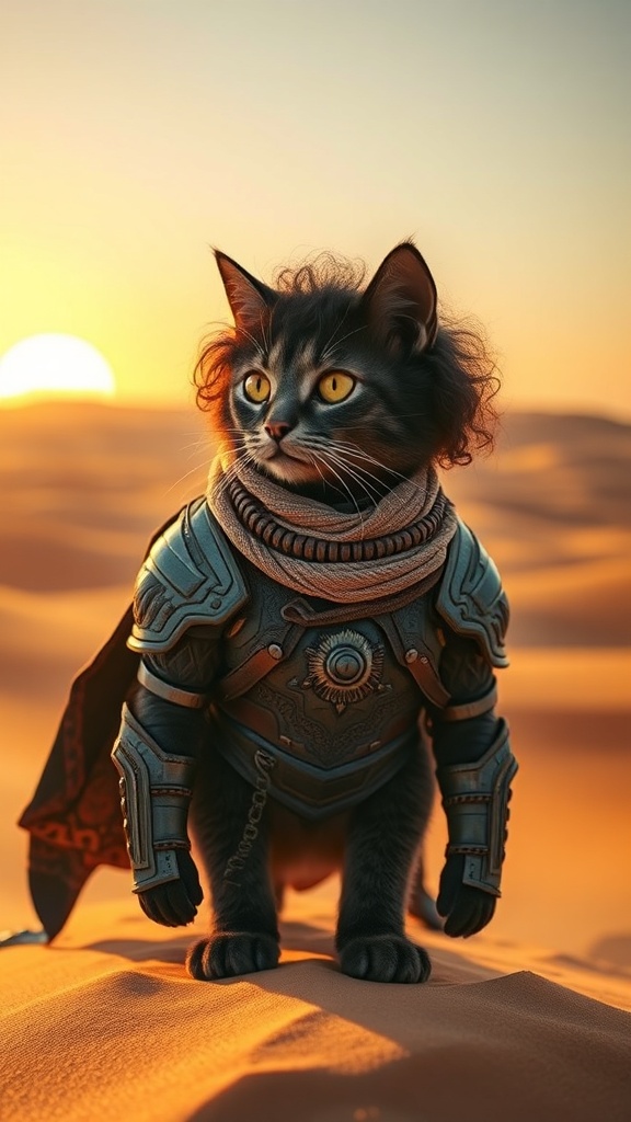 An anthropomorphic cute cat as Paul Atreides in the desert, dark curly hair, wearing intricate full armor with an elegantly flowing scarf around its neck, stands on the sun-drenched dunes of planet Denis. The cat's expressive eyes gaze into the horizon, capturing a sense of determination and wonder. The setting sun casts a golden hue over the landscape, accentuating the hyper-detailed textures of the fur, armor, and sand. Shot with a Sony A7 III and a Canon RF 24-70mm f/5 L IS USM lens, the ultrawide angle encapsulates the vast, rolling dunes, bringing an epic and adventurous feel to this vividly imaginative scene.