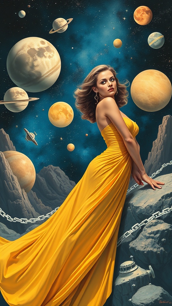 View this AI-generated image featuring a full body painting of a woman in a vibrant yellow dress set against a cosmic backdrop blending the style of heavy metal comic covers with vintage pin up aesthetics the scene features planets that resemble candy floating in a space themed landscape the woman s