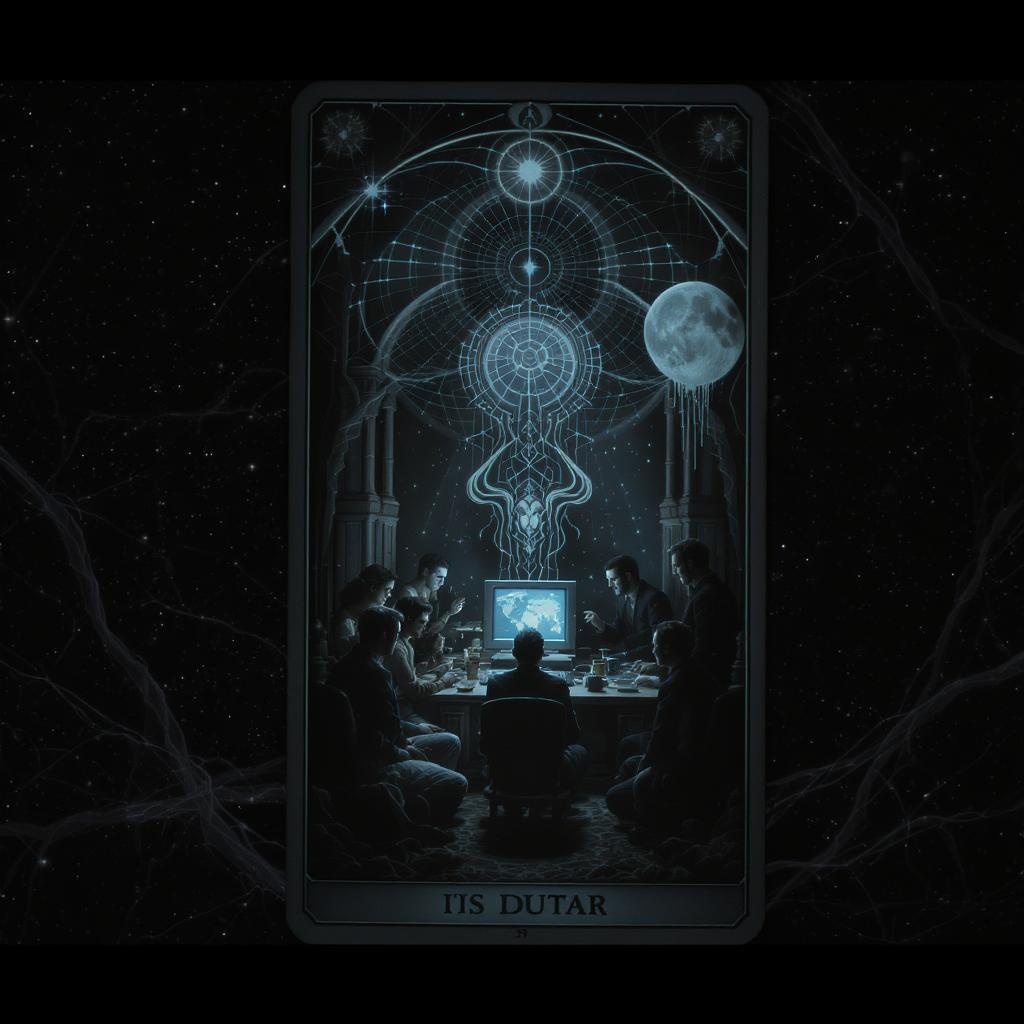 A 1982 screengrab from a supernatural mystery thriller featuring a high-definition backdrop with an intricate composition exuding a surreal, ethereal aura. In dim, cinematic lighting, a diverse group of individuals is gathered around a computer that symbolizes artificial intelligence, set within an enigmatic and dreamlike environment. The scene resembles the intricate design of a tarot card, weaving their stories into the visual narrative. The ambiance is dark and cool with a mystifying esoteric essence, devoid of clouds or stars, yet captivating in its raw-style execution and unique elements that evoke strange circumstances and intrigue.