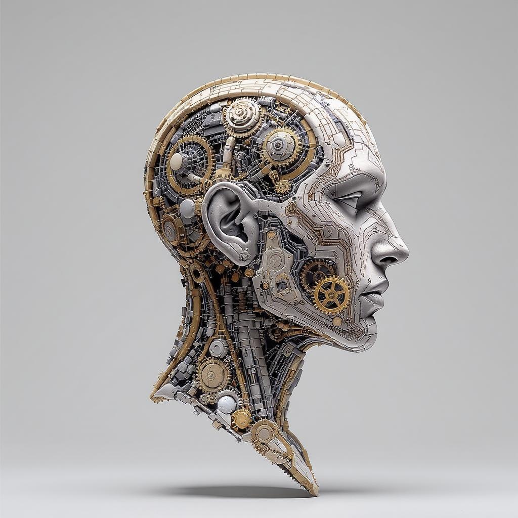 A highly detailed abstract sculpture depicting a head and neck in slight profile, featuring skin comprised of complex, interwoven patterns with visible gears and mechanical components, blending organic and technological aesthetics. The palette includes muted tones of white, black, brown, blue, with touches of gold and silver. The setting involves a light gray background with diffused lighting that emphasizes the intricate details without casting shadows, creating a harmonious balance between realism and abstract art. No base is present, allowing the sculpture to appear as if floating.