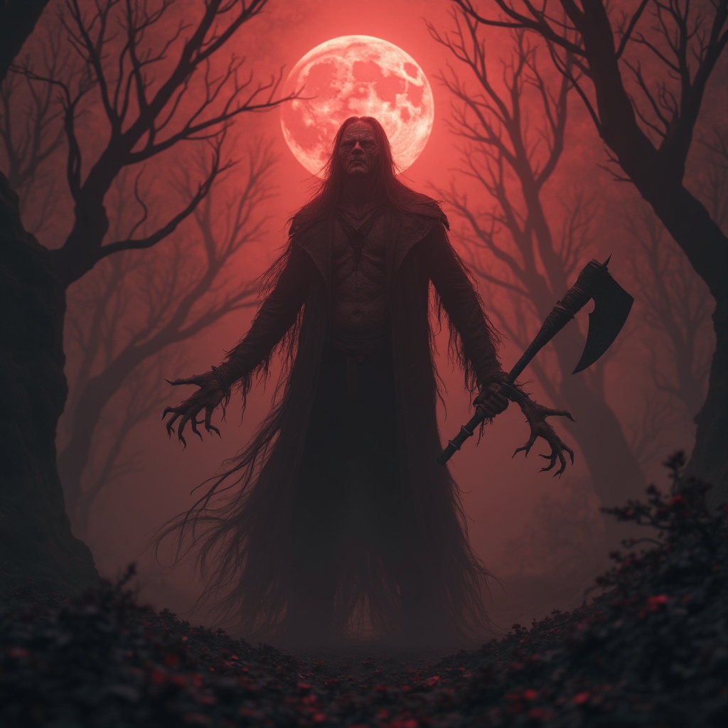 View this AI-generated image featuring a chilling hyper realistic portrayal of a necromancer resembling jack the ripper stands in a haunting fog laden landscape he wields a terrifying axe his face etched with a sinister expression behind him a blood moon casts an eerie glow over a twisted red forest