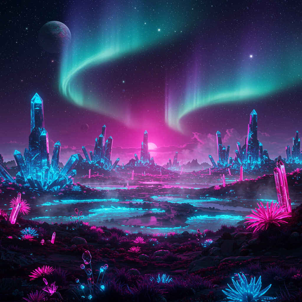 A vibrant alien landscape bathed in neon lights stretches across a vast horizon, where towering crystalline structures glow in hues of electric blue and radiant pink. Exotic flora pulsates with luminescent colors under a sky filled with swirling auroras and distant celestial bodies. Misty vapors rise from phosphorescent pools, casting an otherworldly glow on the unique terrain.