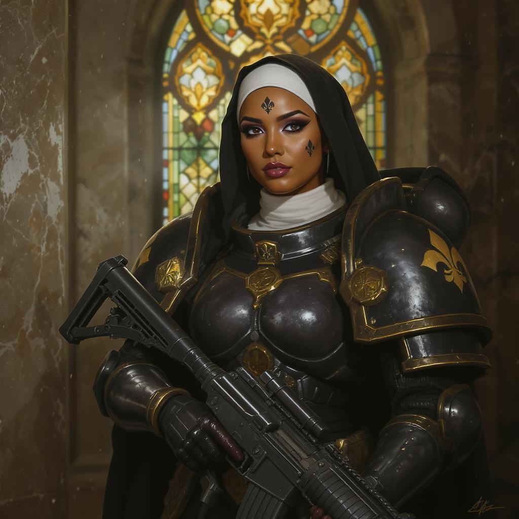 A striking modelshoot-style image featuring a full-body portrait of an incredibly beautiful woman, embodying the essence of a Sister of Battle. She stands confidently with a bolt rifle, positioned before an intricate stained glass window. Her tanned skin is adorned with a distinct fleur de lys tattoo on her face, and her armor bears ornate wax seals. Her face is symmetrical and detailed, with reflective eyes, dark eyebrows, and expertly applied mascara. Her makeup enhances her features, heightening her majestic presence. Clad in sci-fi nun armor inspired by the Warhammer 40k universe, she exudes strength and grace. The setting includes marble walls and floating dust particles, creating a sense of timelessness. Masterful lighting techniques such as rim and chiaroscuro lighting add depth and drama, evoking the style of professional impressionist oil paintings by artists like Waterhouse, John Constable, and contemporary creators like Jeremy Mann and Greg Manchess. This high-detail, intricate piece is trending on platforms like ArtStation and CGSociety, blending influences from Studio Ghibli and Makoto Shinkai, embodying a visually stunning and artistically rich composition.