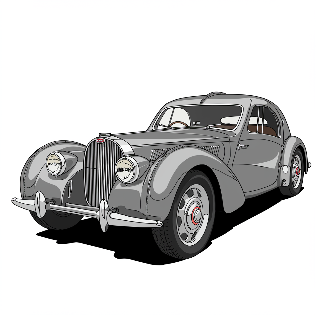 View this AI-generated image featuring illustrate a vintage 1938 bugatti type 57sc atlantic in detailed clipart style capturing its iconic sweeping curves elegant teardrop fenders and exquisite luxurious details introduce subtle creative modifications such as a modernized grille or unique wheel desi