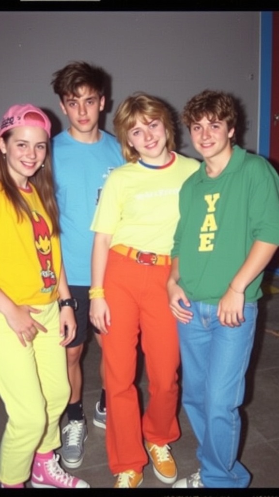 View this AI-generated image featuring vibrant snapshots of quirky 90 s teens posing in colorful retro outfits captured with the nostalgic grain of a vhs camcorder. Created using advanced AI technology, this image showcases vibrant colors. Perfect for creative projects, digital art, inspiration.