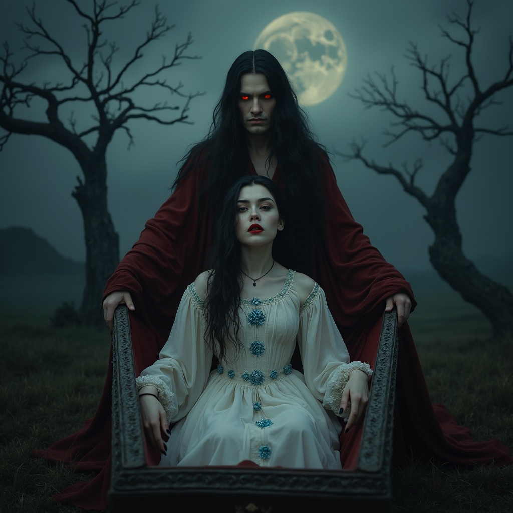 In this evocative scene, set against a vast and ominous landscape, a female vampire rises from her antiquated coffin at the heart of the tableau, eyes glowing with a supernatural fire. Her skin, as pale as moonlight, bears an ethereal quality that betrays her otherworldly origin. Tresses of dark hair cascade to her waist, shimmering faintly under the dim light. She drapes herself in a flowing white gown, detailed with delicate blue floral embroidery along the edges, the fabric frayed and worn in places. Her lips a striking, vivid red, slightly parted to reveal sharp fangs, with a faint crimson sheen at the corners, her eyes betraying a fierce, insatiable hunger. Behind her, a male vampire stands, eyes equally ablaze with an unnatural intensity. His ashen skin complements his long, flowing dark hair, reflecting the ghostly light in soft, metallic glints. He dons a deep red cloak, its hem and sleeves adorned with intricate patterns, the garment tattered yet majestic. His crimson lips part to reveal deadly pointed teeth, the corners also touched with a mysterious sanguine glow, his stare penetrating and ravenous. To the left, twisted trees rise, dark and sinister, their skeletal limbs clawing at the tempestuous sky above, where clouds churn and seethe. To the right, the open coffin rests, its lid thrown back to unveil a shadowy, enigmatic interior. The exterior is embellished with meticulously carved designs, its lining soft and likely silk or satin, exuding a sense of elegance. The entire scene drips with an atmosphere of eerie suspense and impending supernatural mystery.
