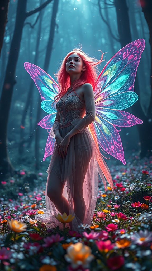 Enchanted woodland landscape featuring a chronomancer, a mage with mastery over time, possessing flawless skin. The scene is illuminated by soft particles of luminescent light, with the mage's striking neon multi-colored hair and vibrant fairy wings glistening in the ambiance. Intricate patterns of fractal energy swirl around, adding depth to the image reminiscent of an open-world fantasy adventure. The forest floor is a carpet of diverse, blooming flowers, contributing to the cinematic quality of the scene. Captured in a 32k UHD resolution, the photograph showcases impeccable anatomy and lifelike realism, with professional-grade lighting and vibrant, rich colors. The camera captures the mage in a whole-body cowboy shot from afar, staring directly at the viewer with a cinematic perspective and deep depth of field for a truly immersive experience.