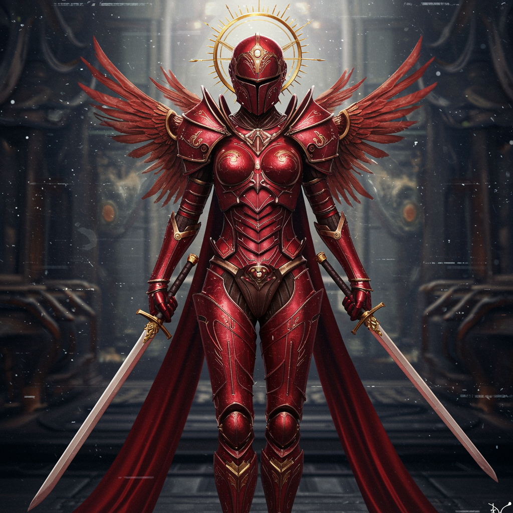 View this AI-generated image featuring goddess warrior knight in sci fi setting adorned in beautiful futuristic space armor the design is both decadent and divine evoking a celestial presence the armor is ultra realistic battle worn featuring a striking red color with intricate and elegant details t