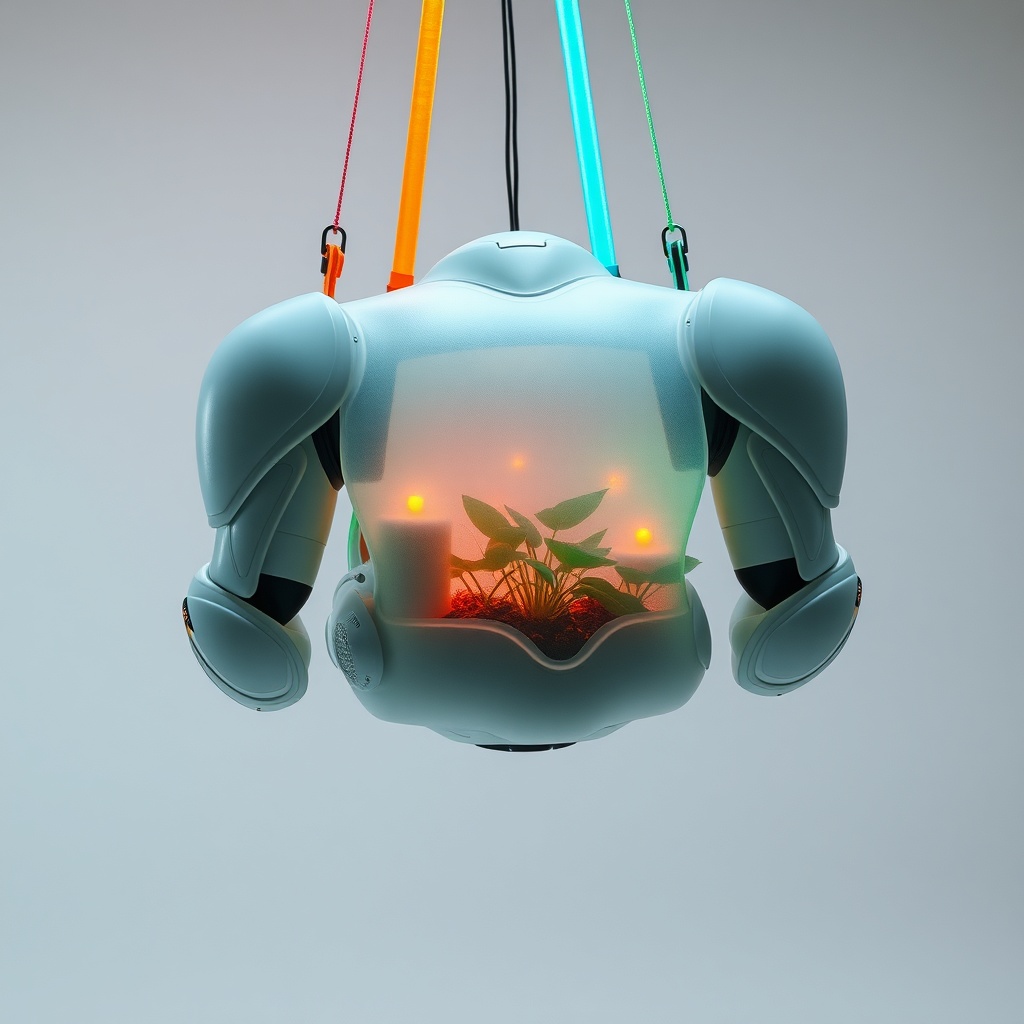 A futuristic photoshoot presents an avant-garde, alien full armor, suspended and highlighted by vibrant, crisscrossing neon straps that dominate the scene. Crafted from translucent, frosted material with a matte finish, the armor's cloudy surface subtly reveals the interior with a blurred glimpse. Inside, glowing plants and minimalist electronic components emit soft orange and green hues, harmoniously blending biotechnological and organic elements. The armor's abstract design features elongated curves and irregular geometric shapes, moving away from traditional humanoid forms for a fluid, alien-like structure. The minimalist exterior lacks a humanoid outline, exuding a futuristic, unconventional appeal. The semi-translucent material offers a faint, ethereal glimpse into the interior where blurred plants and components enhance its otherworldly charm. Suspended in mid-air, the armor is secured by electric blue, neon orange, and vivid green mooring straps, contrasting with its soft matte finish. These straps, holding the piece like a high-end art installation, juxtapose the sleek, futuristic design with practical utility. A minimalist background with neutral tones and soft gradients maintains focus on the armor. Exotic moss, alien-like flora, and vibrant yellows, purples, and greens subtly enhance the design, adding natural life to the technological aesthetic. Captured from an unconventional angle, extremely close to showcase intricate details, the texture of the frosted material, and the vibrant, chaotic mooring straps framing the scene. Soft yet precise lighting creates reflections and highlights, contrasting the glowing plants, minimalist structure, and bold neon straps. Shot in ultra-realistic, hyper-detailed 35mm photography style, this composition evokes a high-tech fashion magazine photoshoot with sharp, vivid details immersing the viewer in this ethereal, futuristic display.