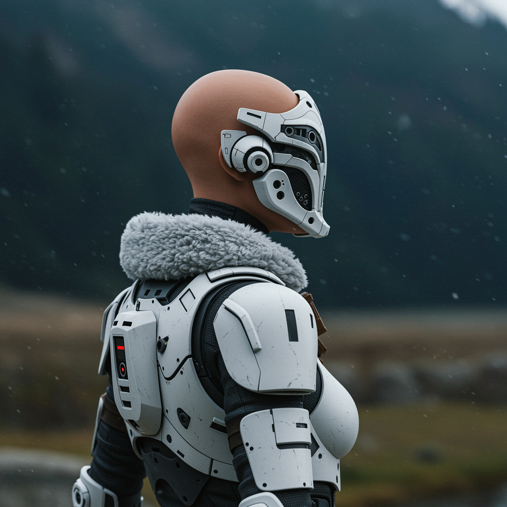 white sci-fi female armor with intricate cybernetic helmet, insulated full-body suit resembling a spacesuit, showcasing a sleek bald design, featuring an abundance of fine detail in a cinematic sci-fi style. Captured outdoors with natural light, it exudes photorealism and a cinematic quality. Utilizes ray tracing for the highest quality and detail, shot in third-person view, incorporating a blur effect and long exposure. Presented in 8K Ultra-HD with moody, cinematic lighting for an atmospheric feel. Aspect ratio of 9:16 to emphasize vertical composition, offering a striking, immersive image.
