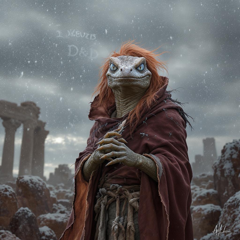 View this AI-generated image featuring a lizardfolk draped in a tattered cloak with twinkling blue eyes and fiery ginger hair stands amidst ancient ruins under an overcast sky soft god rays pierce through the clouds illuminating traces of frost on the stones they wear a sly smirk evoking an air of m