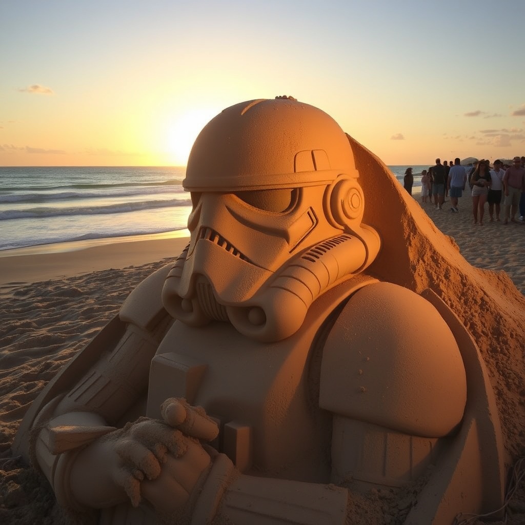 A breathtaking sand sculpture depicting a stormtrooper emerges on the beach, showcasing an array of intricate details and an exquisite design. Its lifelike helmet and armor are expertly crafted, capturing the iconic essence of the character with mesmerizing precision. As the sun sets, shadows accentuate the fine etchings, giving the sculpture an almost ethereal presence against the backdrop of the ocean waves gently lapping at the shore. Beachgoers gather in awe, admiring the artist's skill in transforming ordinary sand into an extraordinary piece of art.